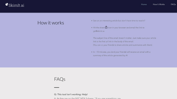 Skim It is an innovative tool styled for today's brisk pace of life, where skimming over mountains of information is an everyday exercise. This tool is a shopper's delight and a researcher's companion. Skim It utilizes advanced machine learning algorithms to craft summaries of online articles, reports, and other forms of textual content. It grabs the key points, so you can quickly get the gist of a web page. Skim It speaks to our modern times in a language a speed reader would understand. It's like your own personal assistant doing all the dull scanning for you while you sip your coffee and flip through the highlights.